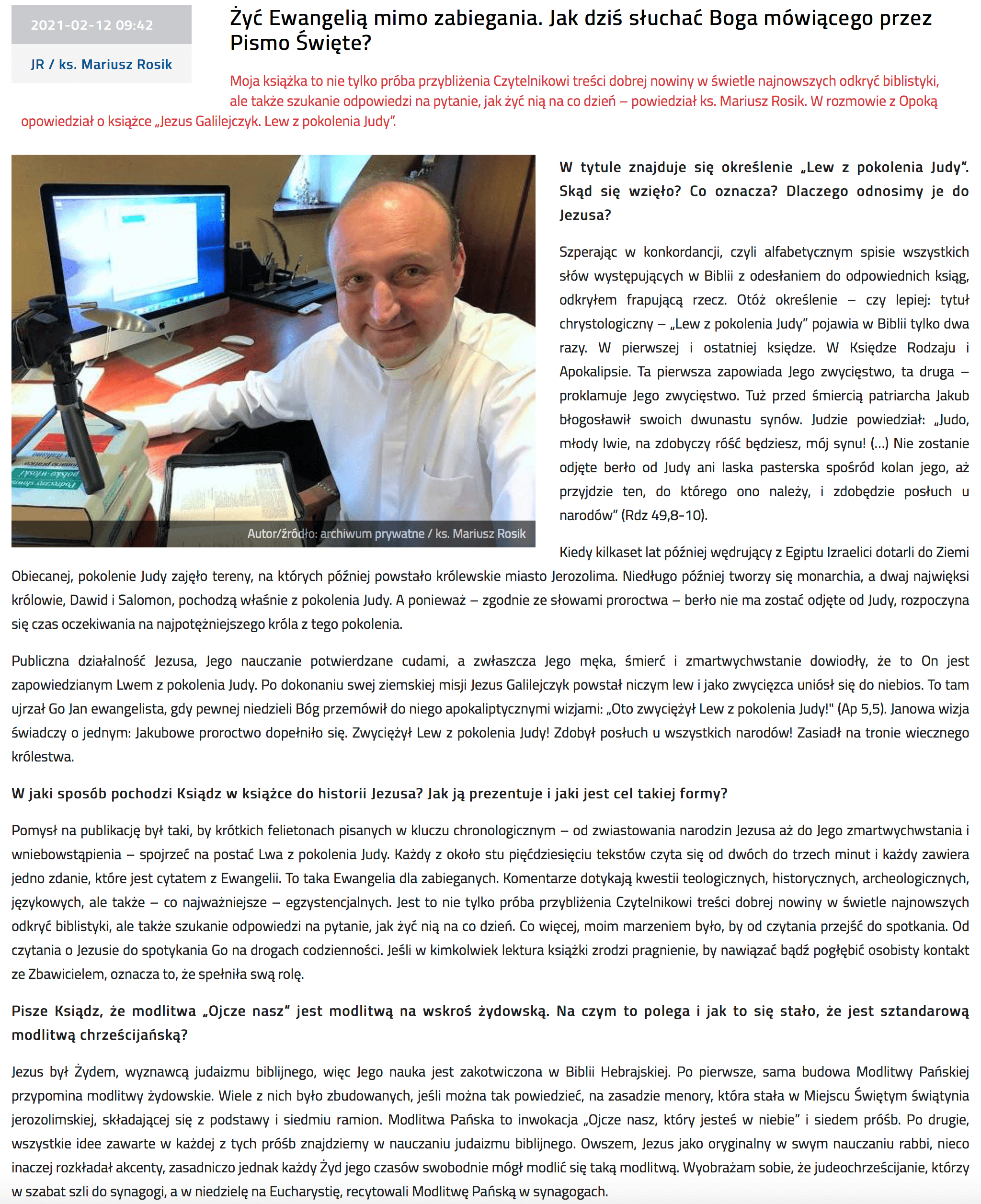 Notka ze strony Wydawnictwa eSPe: „Wybitny biblista ks. Mariusz Rosik z ogromną pasją i niekwestionowaną erudycją tłumaczy historyczne i językowe konteksty ewangelii. Przywołuje realia i zwyczaje świata, w którym żył Galilejczyk, czyniąc jego słowa i zachowania bardziej dla nas zrozumiałymi. Wreszcie pokazuje, jak w osobie ubogiego cieśli z Nazaretu wypełniły się pradawne proroctwa biblijne, począwszy od tego najsłynniejszego – o Lwie z pokolenia Judy”.
