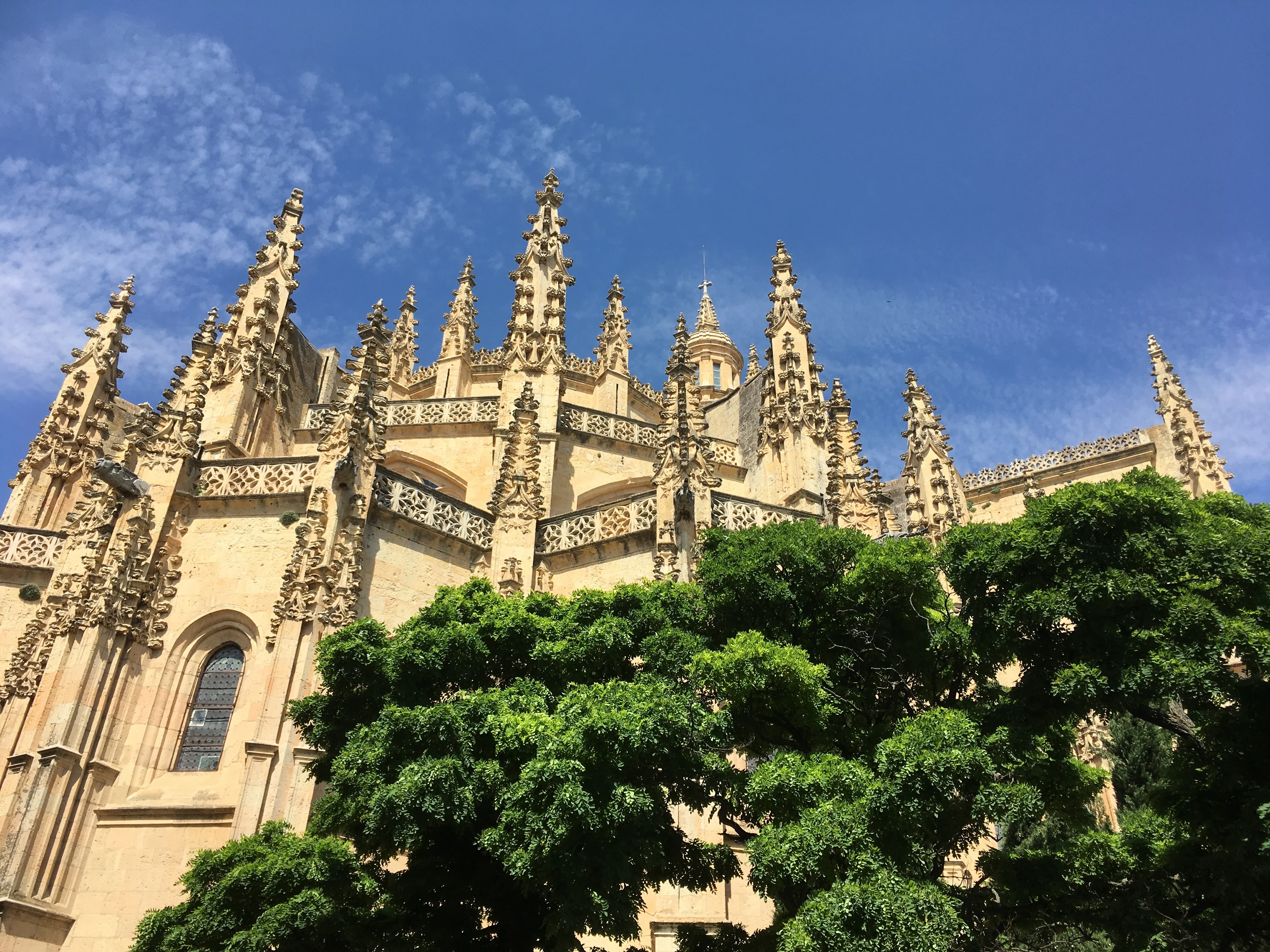 Jednak w niedzielny poranek nie spieszno mi do akweduktu, ale do katedry – na Mszę świętą. Segowijska katedra jest wyjątkowa! Jeśli jedziesz do miasta z zachodniej strony, jej widok zachwyci Cię tak bardzo, że będziesz musiał zwolnić, jeśli nie chcesz narażać życia. Nie bez powodu przylgnęła do niej nazwa la Dama de las Catedrales. Budowę rozpoczęto w 1525 roku. Inwestycja trwała dość długo, jeśli tak można określić czas ponad dwóch stuleciu. Pierwsze szlify były w stylu romańskim, ale z biegiem czasu zastąpiły je późnogotyckie kształty. Kościół nosi wezwanie: Najśw. Marii Panny i św. Fruktuoza. Długość budowli jest niebagatelna – wynosi sto pięć metrów. Bazylika ułożona jest na planie krzyża łacińskiego i składa się z trzech naw. Absydę otacza siedem kaplic. Katedralna wieża liczy 88 metrów.