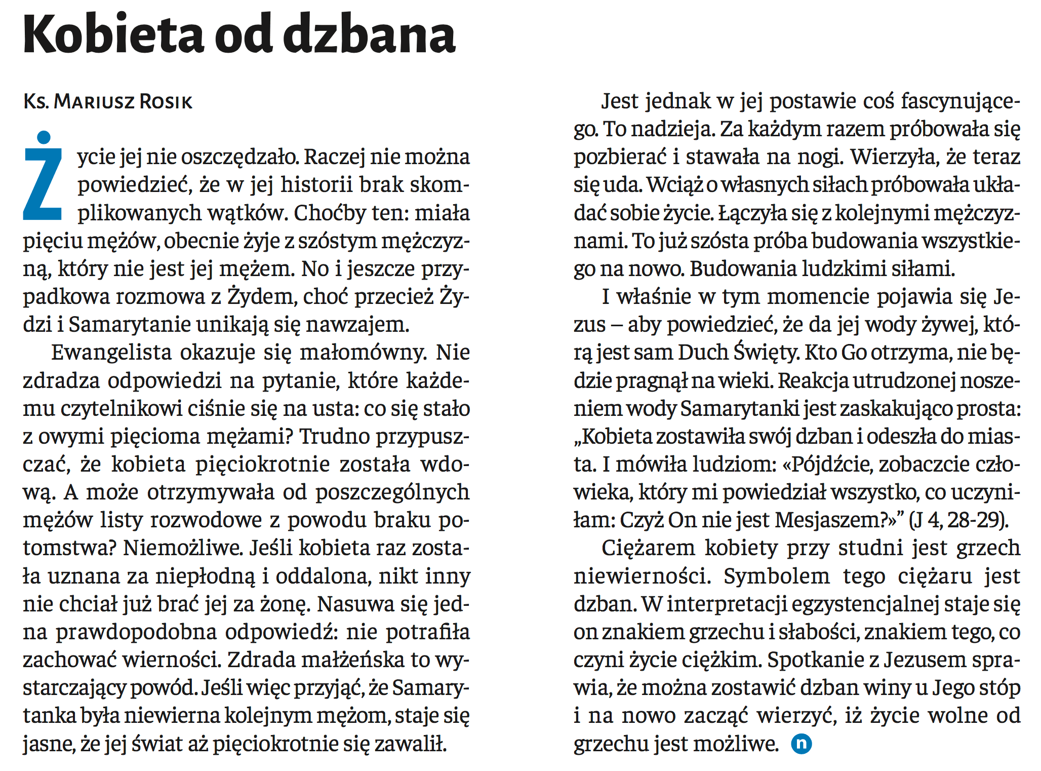 Samarytanka przy Jakubowej studni wcale nie pyta Jezusa o szczegóły Jego mesjańskiej wizji, a On nie kwapi się, by je ujawniać. Wystarczyło, że Jezus przejrzał jej przeszłość i niczym prorok mówił o oddawaniu czci Bogu. Wystarczyło, że powiedział o jej pięciu mężach i zinterpretował symbol wody żywej. A może wystarczyło już to, że nie podporządkował się żydowskim zwyczajom i zaczął rozmowę z mieszkankę Samarii? Nie wiadomo, który moment dialogu był dla czerpiącej wodę kobiety przełomowy. Nie wiadomo, w której chwili przekonała się w sercu, że Jezus jest prorokiem i oczekiwanym Mesjaszem. Wiadomo natomiast, że ta świadomość otworzyła przed nią nową perspektywę. Reakcja utrudzonej noszeniem wody Samarytanki jest zaskakująco prosta w swojej wymowie: „Kobieta zostawiła swój dzban i odeszła do miasta. I mówiła tam ludziom: Pójdźcie, zobaczcie człowieka, który mi powiedział wszystko, co uczyniłam. Czyż On nie jest Mesjaszem?” (J 4,28-29).