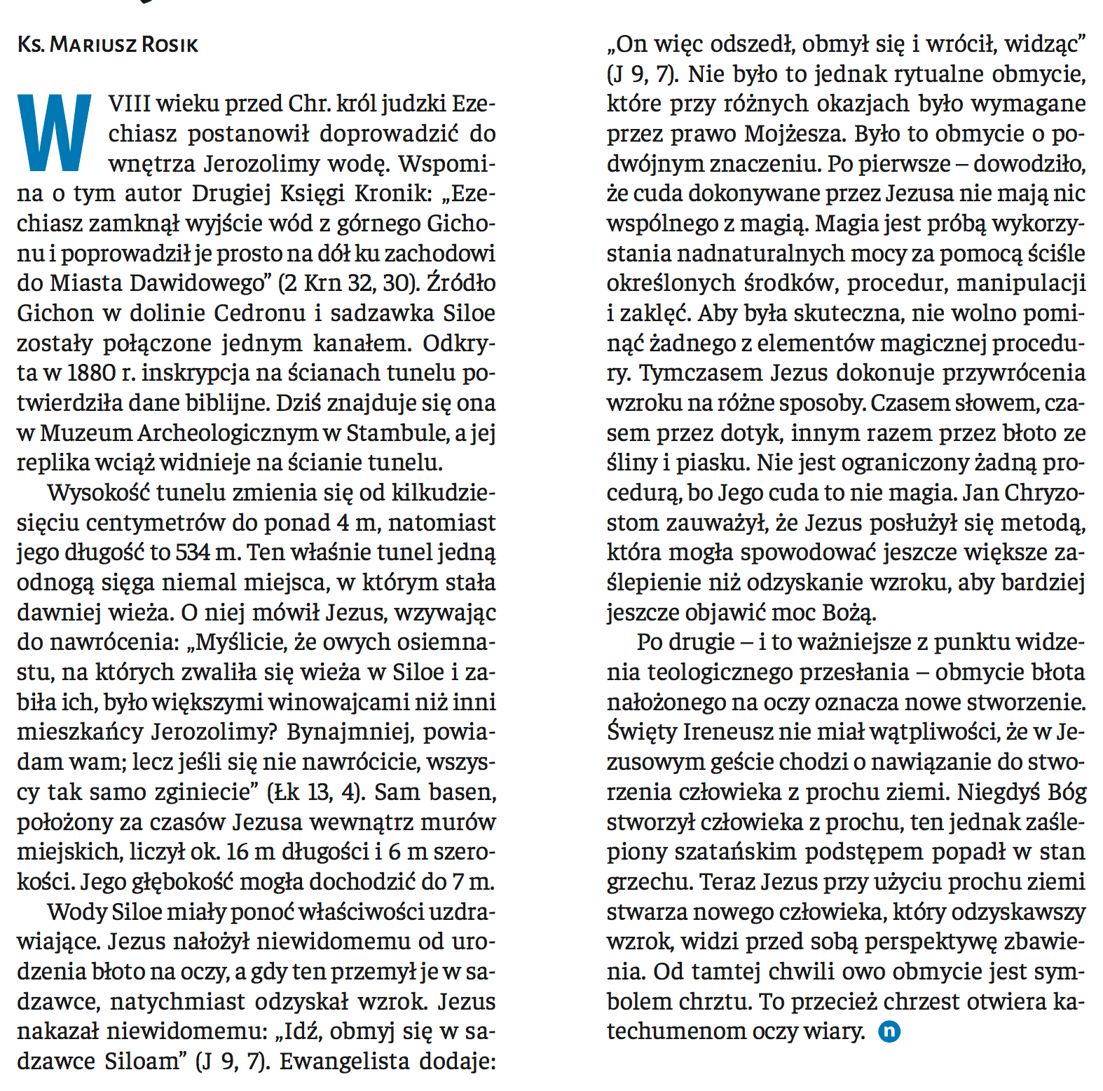 Sam basen, położony za czasów Jezusa wewnątrz murów miejskich, liczył około szesnaście metrów długości i sześć metrów szerokości. Jego głębokość dochodzić mogła do siedmiu metrów. Wody sadzawki Siloe miały ponoć właściwości uzdrawiające. Jezus nałożył ślepcowi błoto na oczy, a gdy ten przemył je w Siloe, natychmiast odzyskał wzrok. Od tamtej chwili owo obmycie stało się symbolem chrztu. To przecież chrzest otwiera katechumenom oczy wiary.