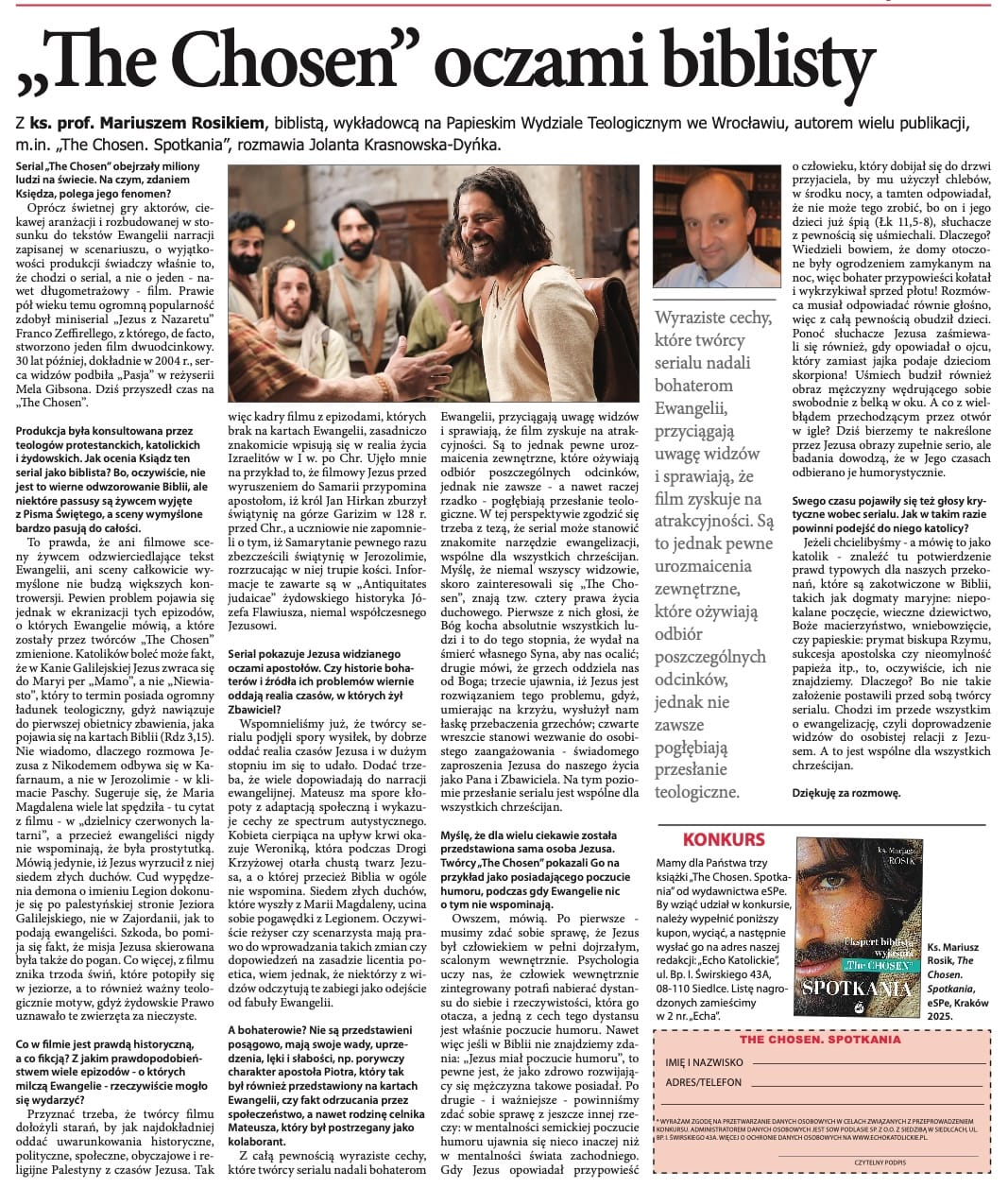 „Z jednej strony chciałem pokazać niezwykłe bogactwo, które reżyser, scenarzyści i aktorzy potrafią wydobyć z Ewangelii, zwłaszcza na poziomie ewangelizacyjnym. Dotarcie do współczesnego człowieka to główny przekaz filmu. Jest też tam wiele scen, które wkomponowują się w klimat społeczny, historyczny, religijny czasów Pana Jezusa, natomiast w Piśmie Świętym nic nie ma na ten temat. Jest to więc swoista licentia poetica reżysera i scenarzystów. W książce znajdziemy nie tyle krytykę czy pochwałę, ale ukazanie różnic między tym co widzimy na ekranie, a tym, o czym czytamy na kartach Ewangelii” – powiedział w rozmowie z Anną Czytowską ks. prof. Mariusz Rosik, biblista autor książki „Spotkania. Ekspert biblista wyjaśnia The Chosen” (Wydawnictwo eSPe).