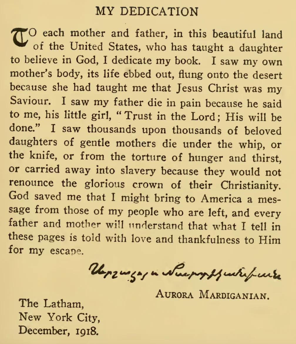 Nie chcę tu opisywać wszystkich okropności, które przeszła ta młoda dziewczyna. Wystarczy wspomnieć, że została zmuszona, by maszerować dwa tysiące kilometrów przez pustynię. Została porwana i sprzedana do niewoli. Widziała swoje koleżanki nabijane na pal. Była świadkiem śmierci ojca i rodzeństwa. Znalazła ciało zamordowanej bestialsko mamy. Udało jej się uciec do Tbilisi (wówczas miasto nazywało się Tiflis), a stamtąd do Petersburga, by ostatecznie przedostać się do Stanów Zjednoczonych. Tam opowiedziała swoją historię. Książka autorstwa Anthony Slide, która jest zapisem rozmowy z Aurorą, nosi tytuł Ravished Armenia and the Story of Aurora Mardiganian, the Christian Girl, Who Survived the Great Massacres. Po raz pierwszy ukazała się w 1918 roku w Nowym Jorku. Pozwólcie, że przytoczę tylko słowa dedykacji: